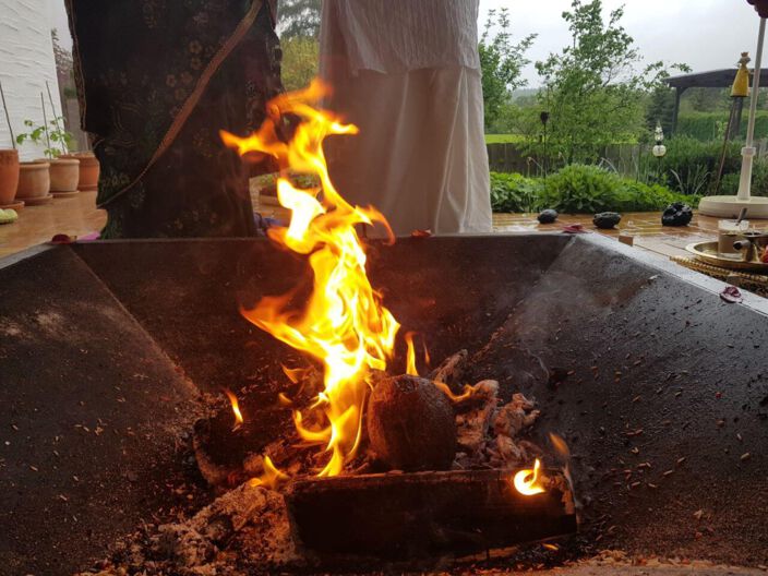 Wir sind voll Dankbarkeit und drücken dies aus, indem wir eine Körnermischung & Ghee ins Feueropfern.