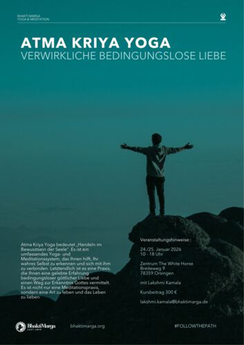 Atma Kriya Yoga bedeutet „Handeln im Bewusstsein der Seele”. Es ist ein umfassendes Yoga- und Meditationssystem, das Ihnen hilft, Ihr wahres Selbst zu erkennen und sich mit ihm zu verbinden. Letztendlich ist es eine Praxis, die Ihnen eine gelebte Erfahrung bedingungsloser göttlicher Liebe und einen Weg zur Erkenntnis Gottes vermittelt. Es ist nicht nur eine Meditationspraxis, sondern eine Art zu leben und das Leben zu lieben.